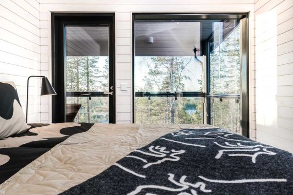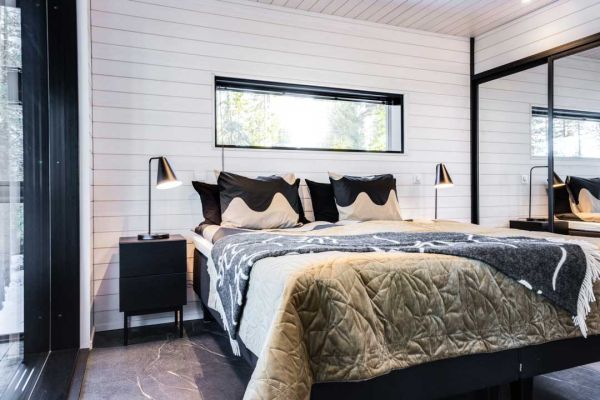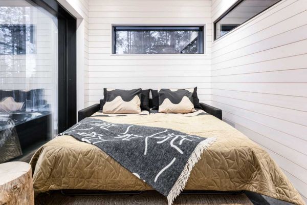 Kaksi makuuhuonetta sijaitsee rakennuksen pääkerroksessa ja kolmas makuuhuone ylimmässä kerroksessa omassa rauhassaan. Yläkerran makuuhuoneesta avautuvat tämän huvilan ylväimmät maisemat niin pohjoisen taivaalle kuin länteen kilometrien päähän aina Riisitunturille saakka. Revontulia ja yötöntä yötä voi ihailla suoraan sängystä. Yläkerran makuuhuoneessa on oma peseytymistila ja wc.