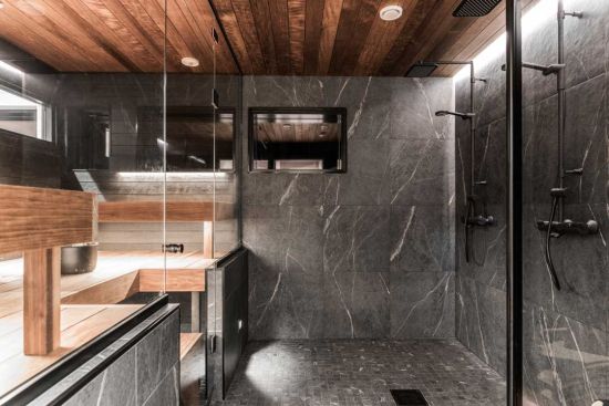 Rakennuksen alakerrasta löytyy harmoonisesti toteutetut, tumman sävyiset sauna- ja pesutilat.