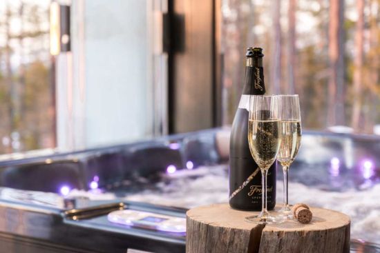 Saunasta avautuu upeat vaaramaisemat oleskelutilan läpi länteen. Oleskelutilasta löytyy olutkaappi ja tv.