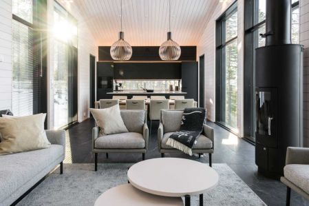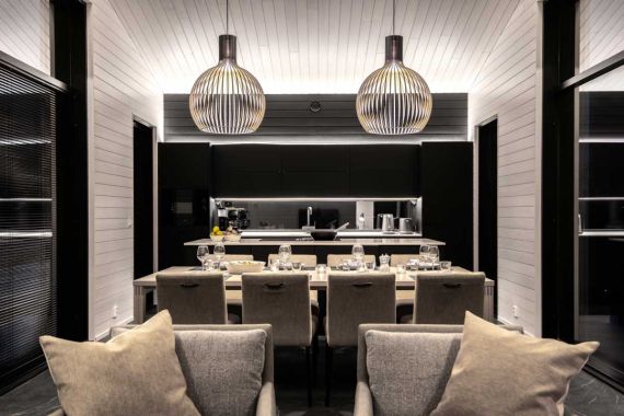 Tämän huvilan ehdoton sydän on suurilla ikkunoilla varustettu olohuone, jonka yhteydessä sijaitsee myös keittiö ja ruokailutila. Olohuoneen isoista ikkunoista aukeaa upeat maisemat länteen. Kirkkaalla kelillä voit ihailla omalta sohvaltasi niin Riisitunturin siluettia kuin myös Kitkajärven maisemia. Olohuoneen ylelliset tilat soveltuvat mainiosti niin oman perheen rentoon oleskeluun kuin vaativampien edustustilaisuuksien päänäyttämöksi.