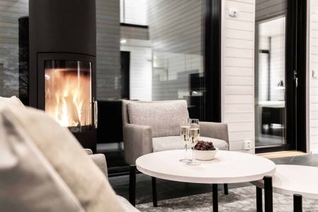 Tunnelmaa pimeneviin iltoihin ja lämpöä tilaan tarjoilee tyylikäs takka.