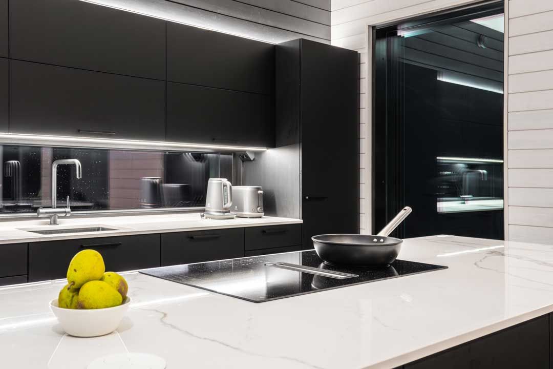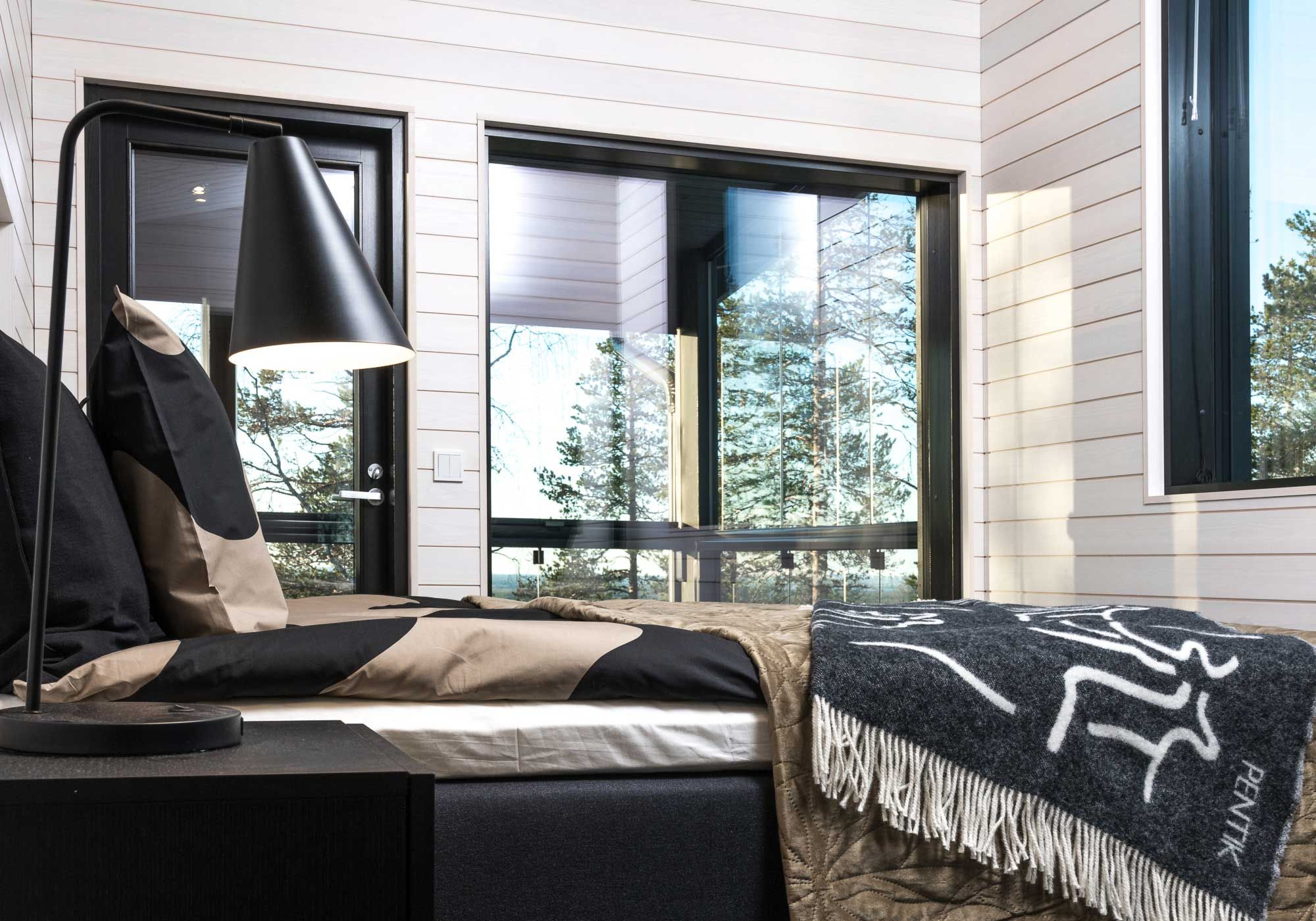 The absolute heart of this villa is the living room with large windows, which also connects to the kitchen and dining area. The large windows in the lounge feature wonderful views to the west. On a clear day you can admire the silhouette of Riisitunturi Fell or the lakeland scenery of Lake Kitkajärvi from your own couch. The luxurious living room is perfectly suitable for a relaxed stay with your family, or a great venue to host even the most demanding of events.