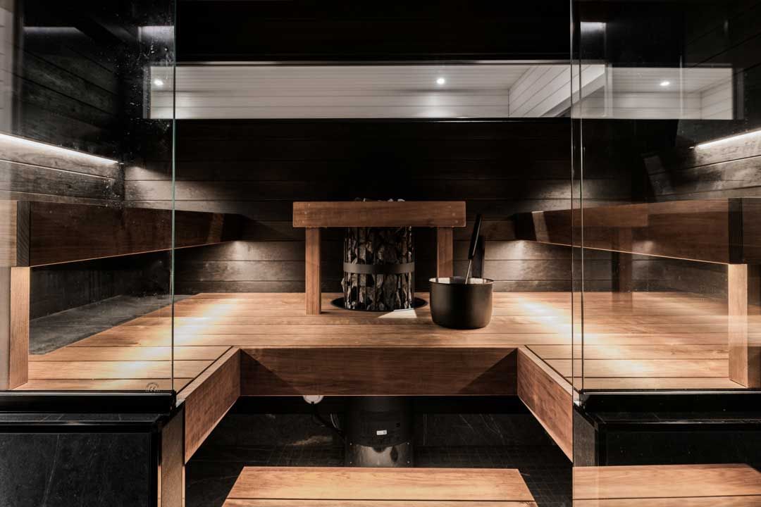 The harmoniously designed, dark-toned sauna and bathroom facilities are situated on the ground floor of the villa.